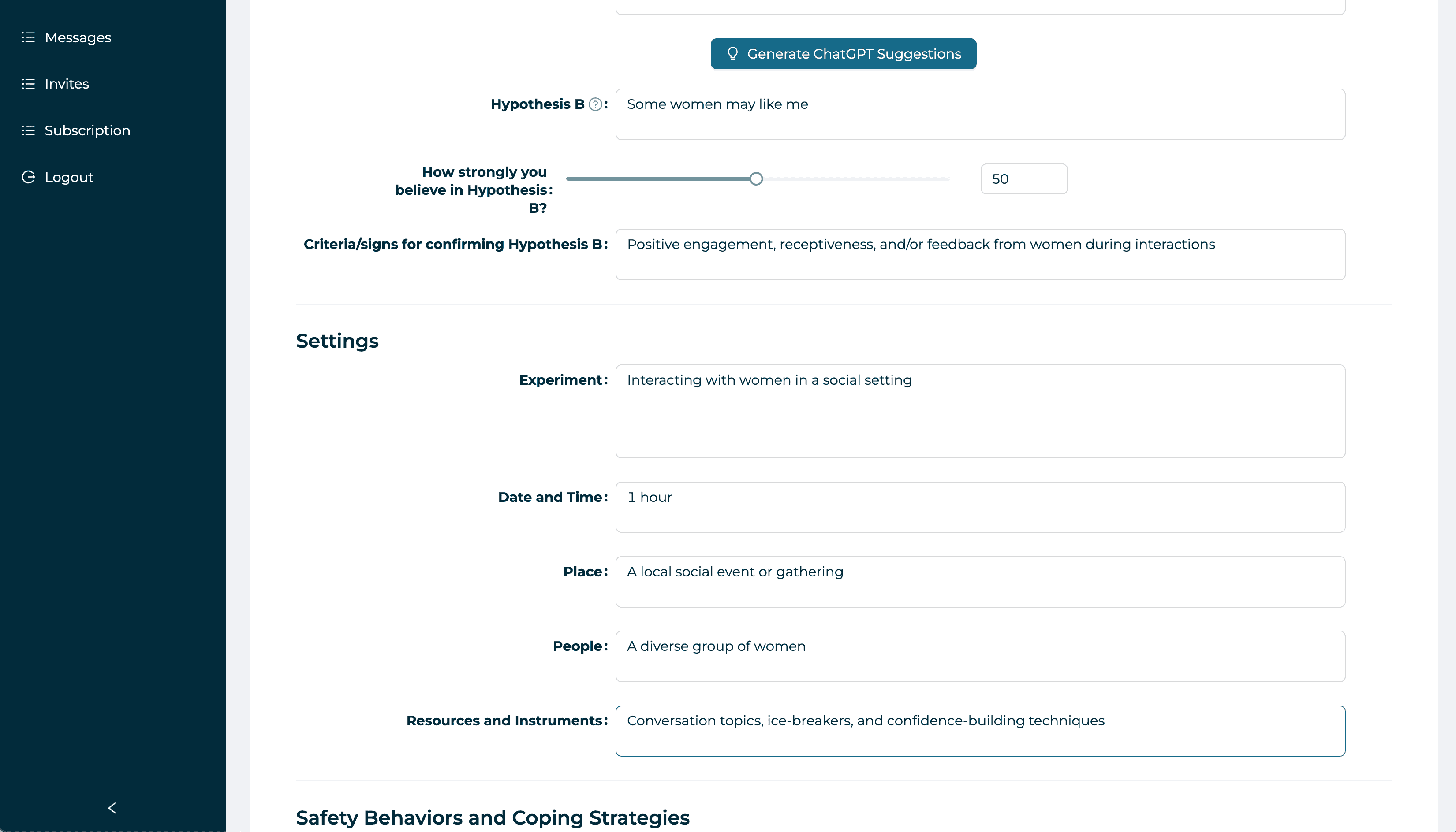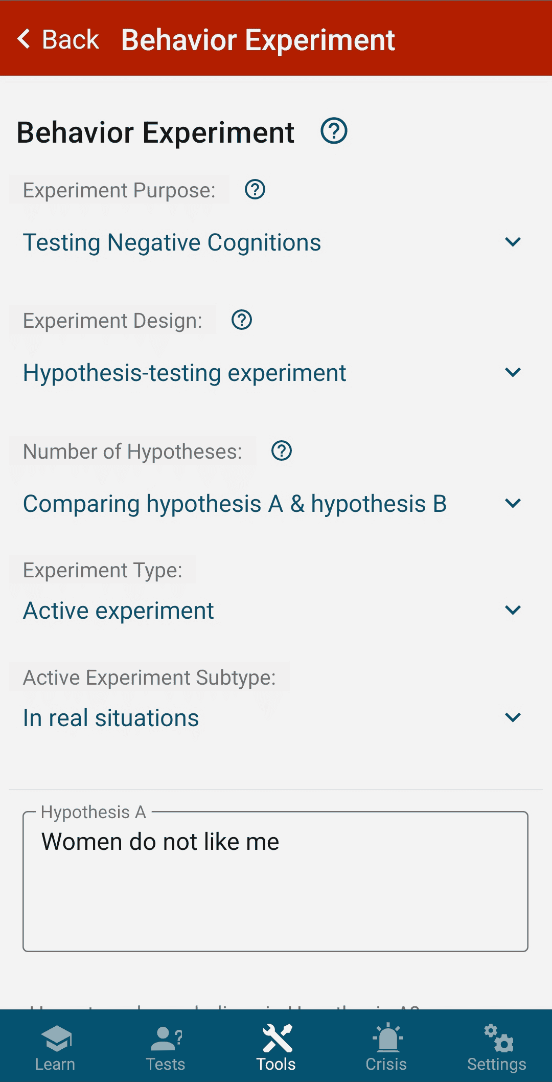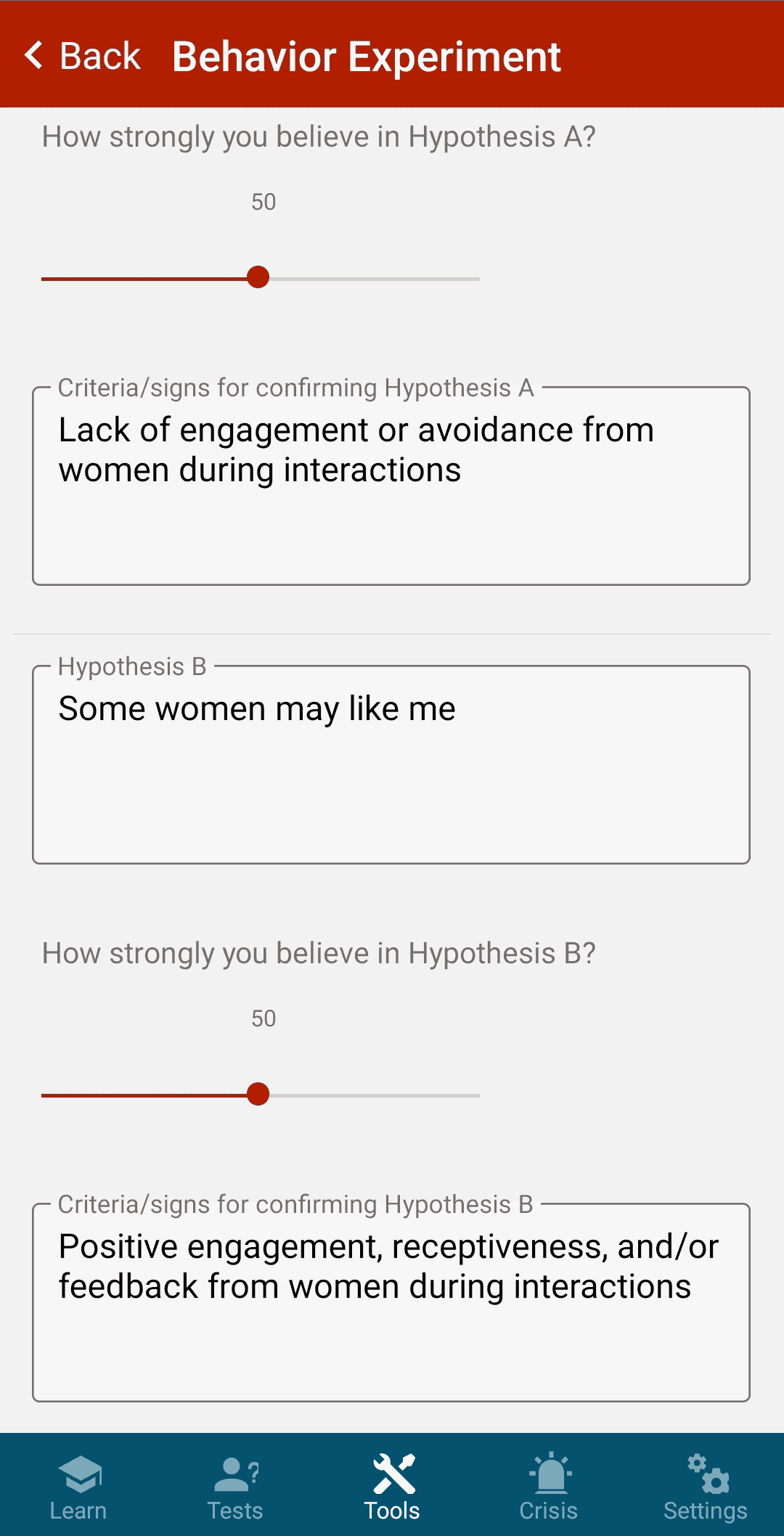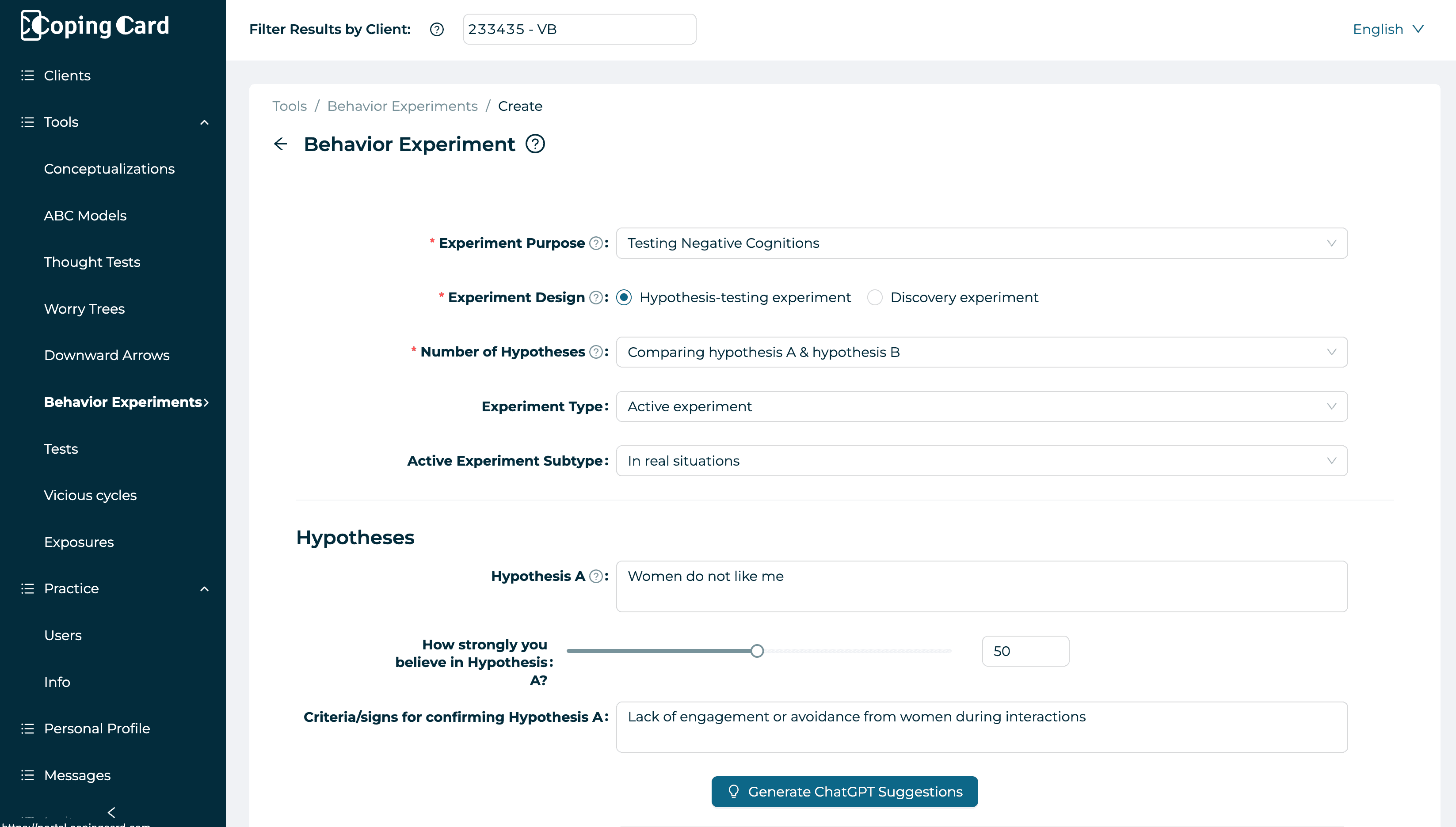 Overall our Platform and Mobile app and the power of AI make the process of coming up with, engaging the client and therapeutic monitoring of the progress substantially more efficient, making it easier to use the Behavioral Experiments technique that has enough evidence to be an important component for treating many mental-health disorders.